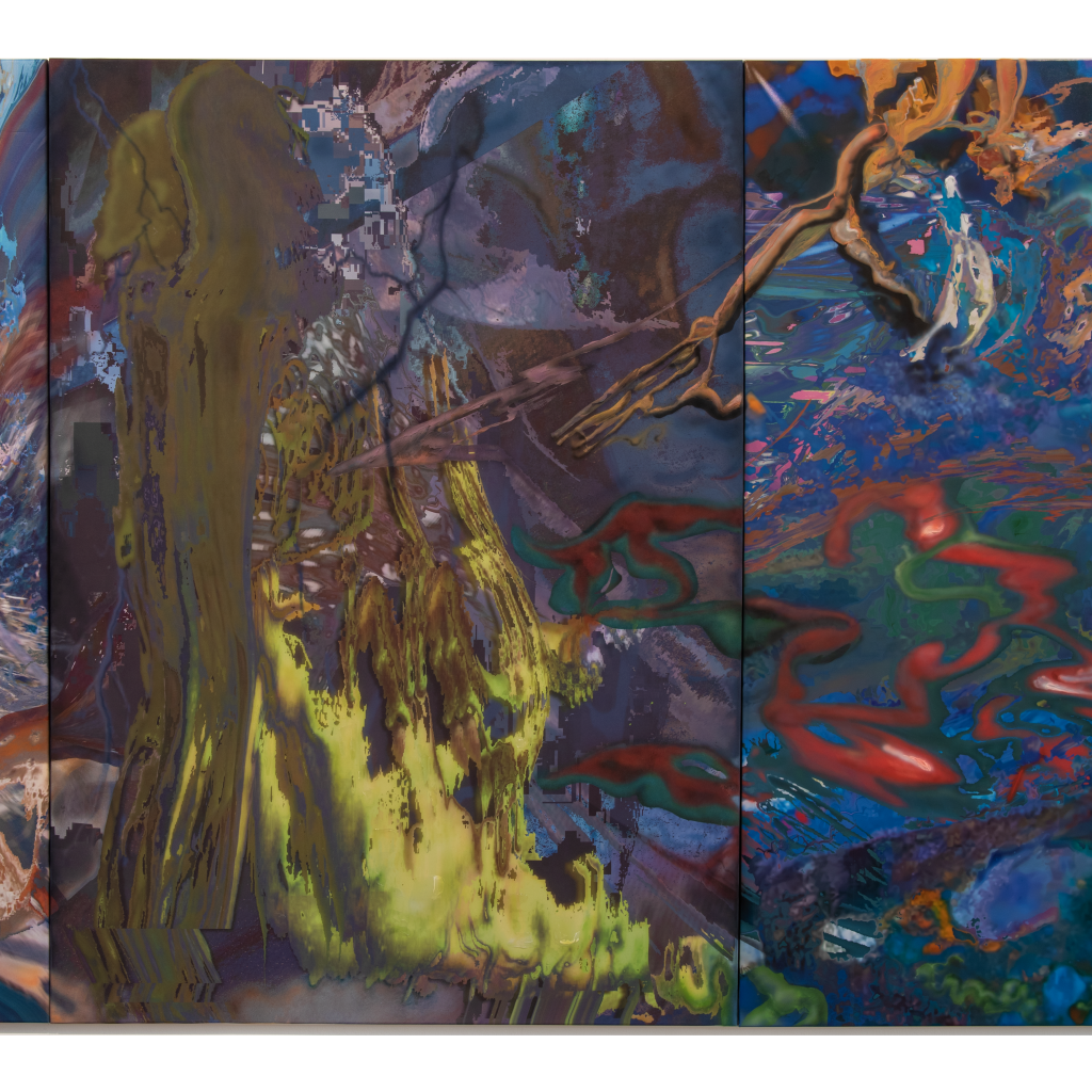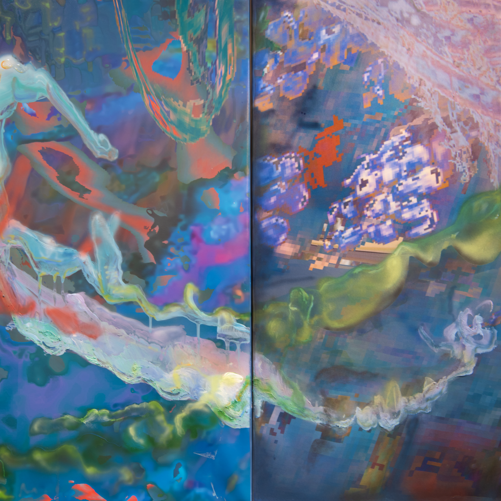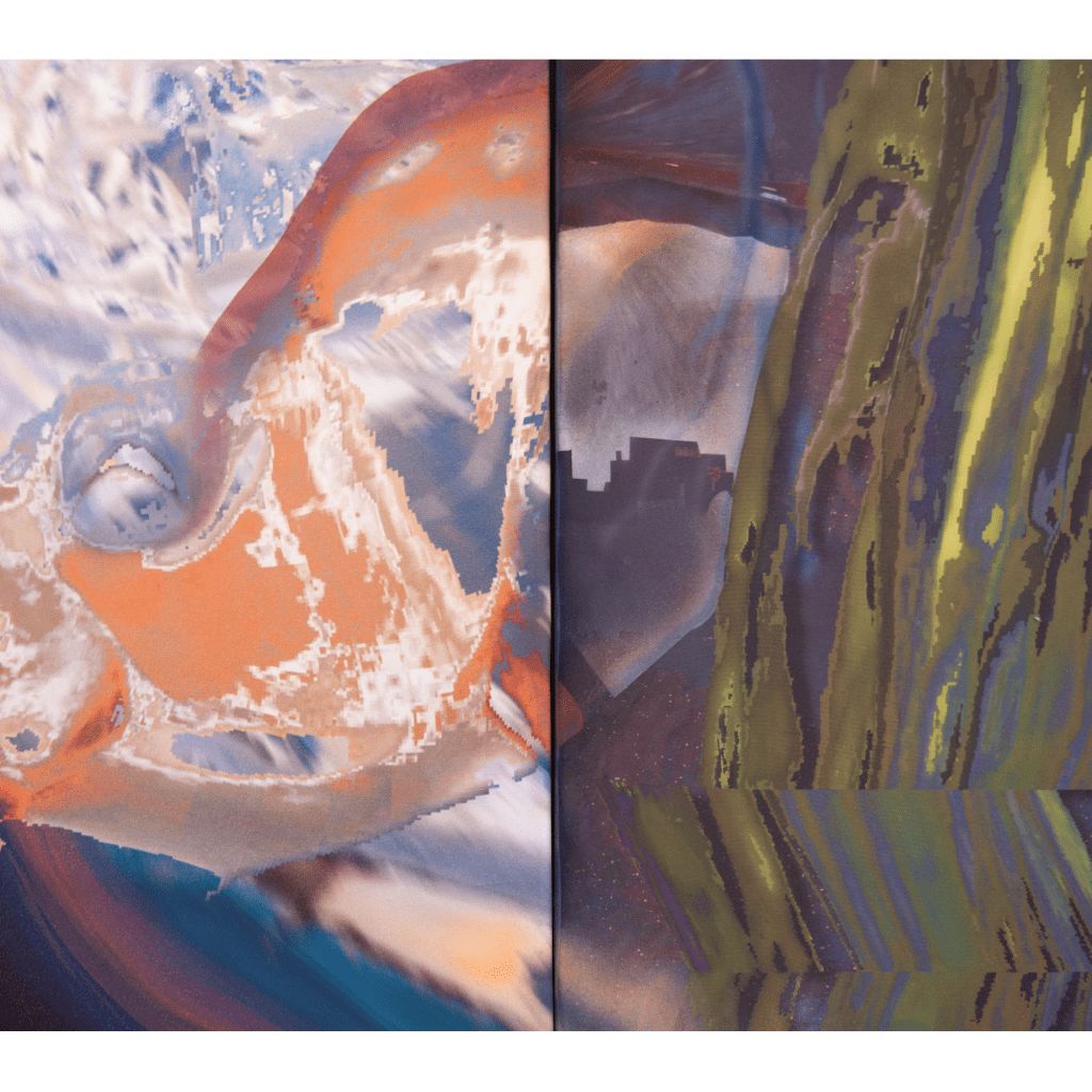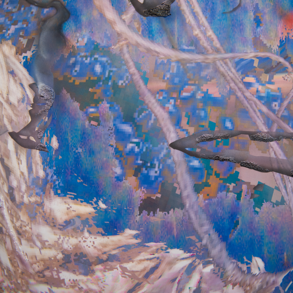 A rabbit who can’t withstand fire points to a crack in the mountain / 불을 견디지 못하는 토끼가 산의 갈라진 틈을 가리키다, Inkjet print and acrylic on fabric, nylon and canvas, 140×600(6pcs)
