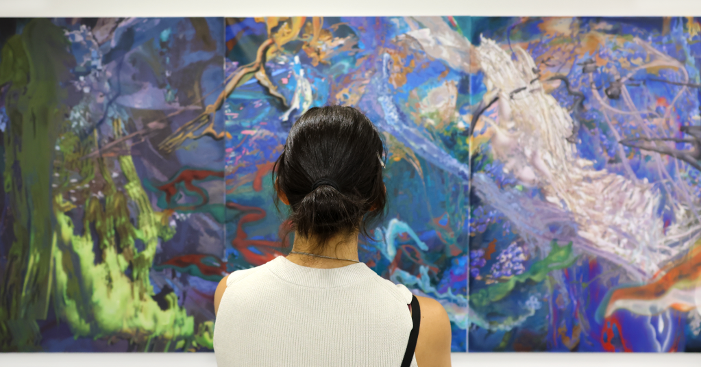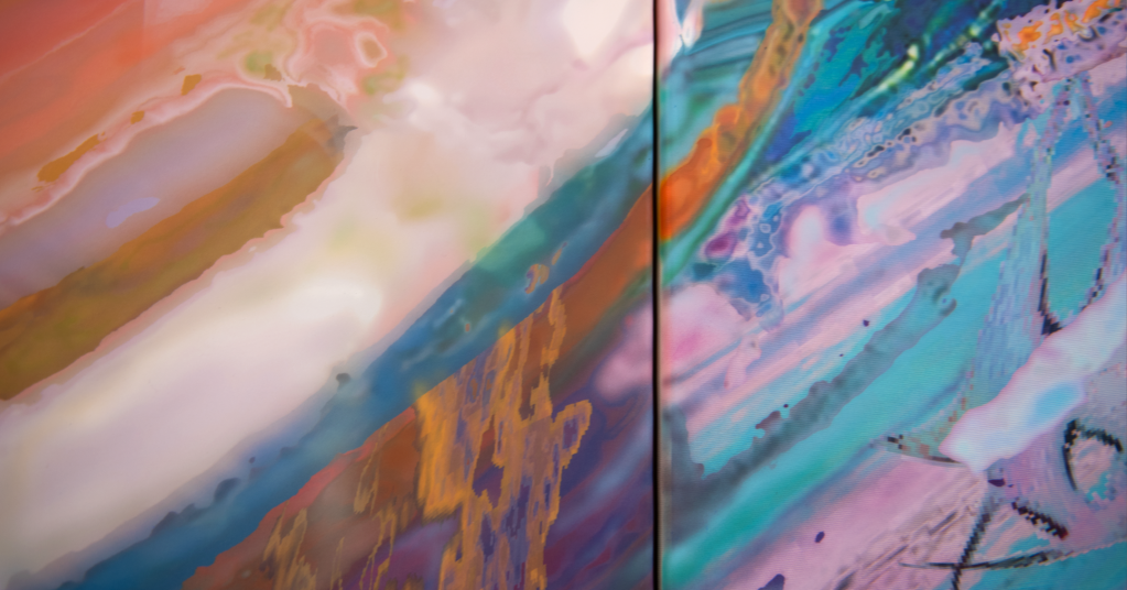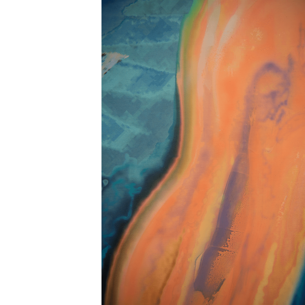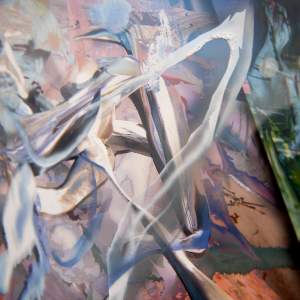 A rabbit who can’t withstand fire points to a crack in the mountain / 불을 견디지 못하는 토끼가 산의 갈라진 틈을 가리키다, Inkjet print and acrylic on fabric, nylon and canvas, 140×600(6pcs)